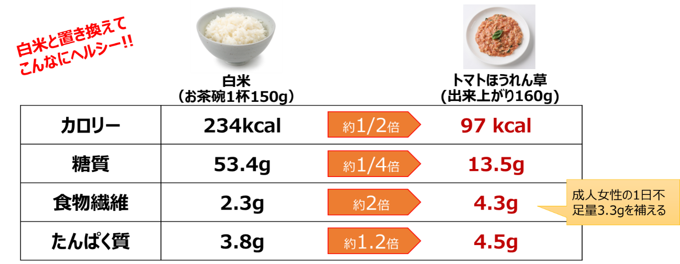 【トマトほうれん草】エネルギー 97kcal、たんぱく質 4.5g、脂質 1.8g、炭水化物 17.8g (糖質 13.5g、食物繊維 4.3g)、食塩相当量 1.0g 【きのこクリーム】エネルギー 103kcal、たんぱく質 3.9g、脂質 2.3g、炭水化物 18.6g (糖質 14.5g、食物繊維 4.1g)、食塩相当量 1.0g |