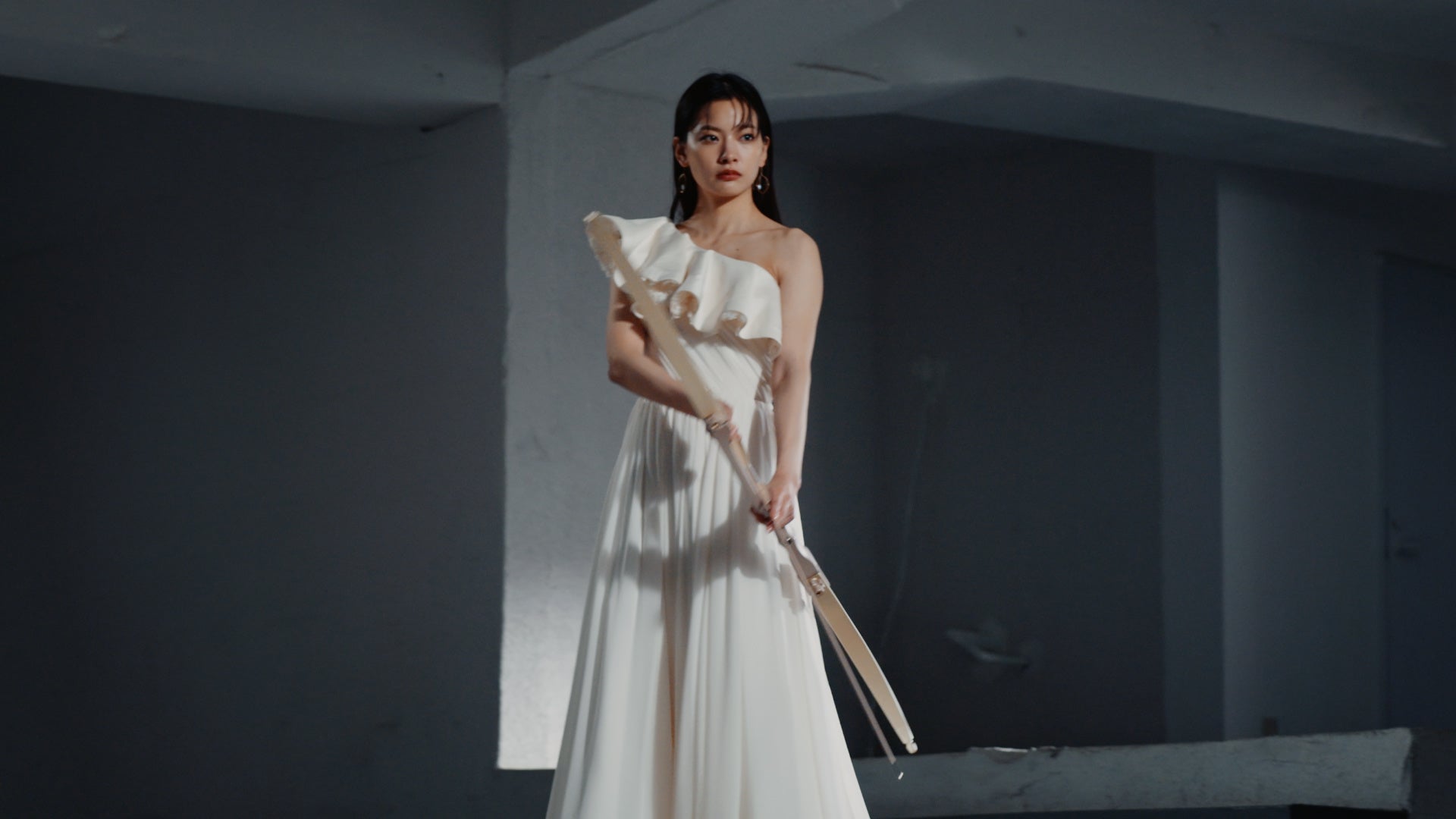 純白のドレス姿でスタジオに入った織田さん。スタッフの皆さんから何度も「綺麗〜!」という声が聞こえてきました。今回、弓矢を放つ撮影でしたが、アーチェリー技術指導の方に実際にレクチャーをしてもらいながら、弓矢や手の位置をご自身で何度も真剣に確認されていました。実は織田さんは以前にもアーチェリー体験があったそうで、難しい弓構えもすぐに習得されていました。一人で全くタイプの異なる二役を演じる撮影でしたが、シーンごとにポージングや表情だけではなく、どんな気持ちで演じるのかを監督と確認し、ひとつひとつの演技を大切にする女優魂を見せてくれました。