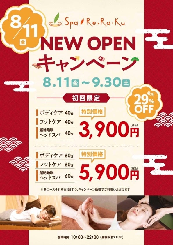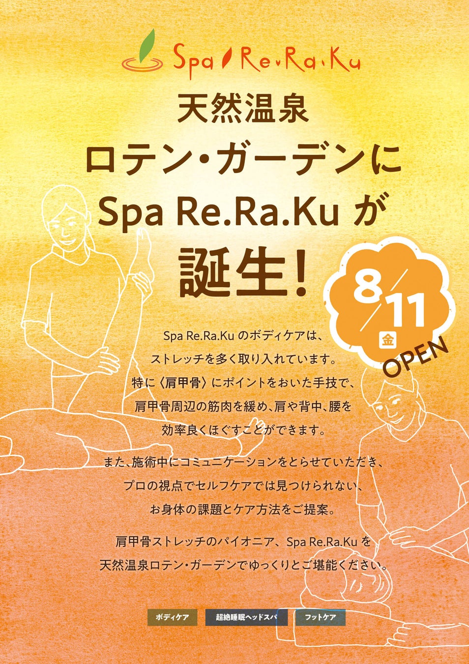 Spa Re.Ra.Ku はRe.Ra.Ku がプロデュースを行い、温浴施設に展開するリラクゼーションスタジオです。入浴後に、身体のケアを行うことで普段より高いリラクゼーション効果が期待できます。