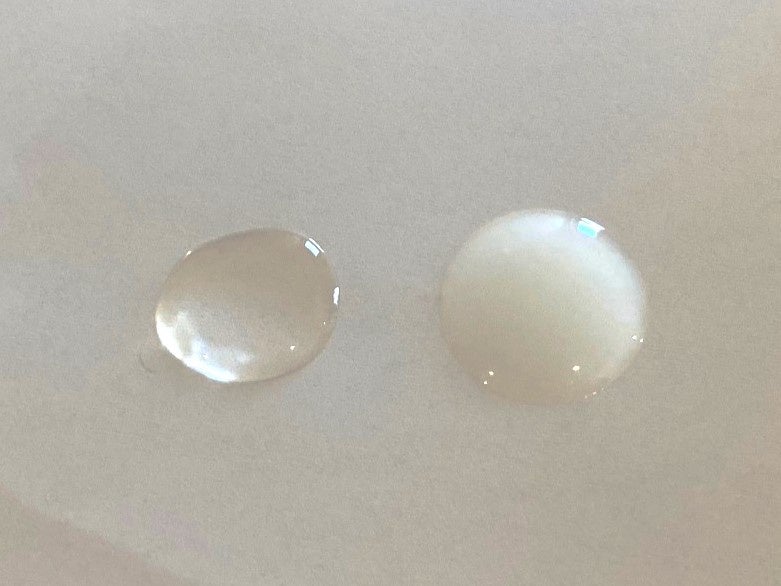 シリーズ1番人気「パイナップル豆乳ローションプレミアム」のテクスチャーと比較すると、乳白色でとろみのある乳液タイプです。保湿感のある乳液タイプですが、ベタつかず肌なじみがよい商品です。