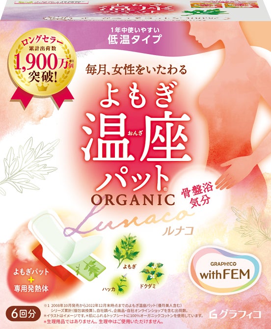 よもぎ温座パットは、韓国伝統美容「よもぎ蒸し」から着想を得た、手軽によもぎ蒸し気分を味わえる温熱パットです。ナプキン型のよもぎパットと専用発熱体を下着に付けて使用し、デリケートゾーンから骨盤周りをじんわり温めます。今回発売する低温タイプのルナコは、寒い秋冬はもちろん、厚着が出来ない春夏の寒暖差やクーラー冷え、不調が気になる女性へ、年間を通してご使用いただきやすい温度設計になっています。