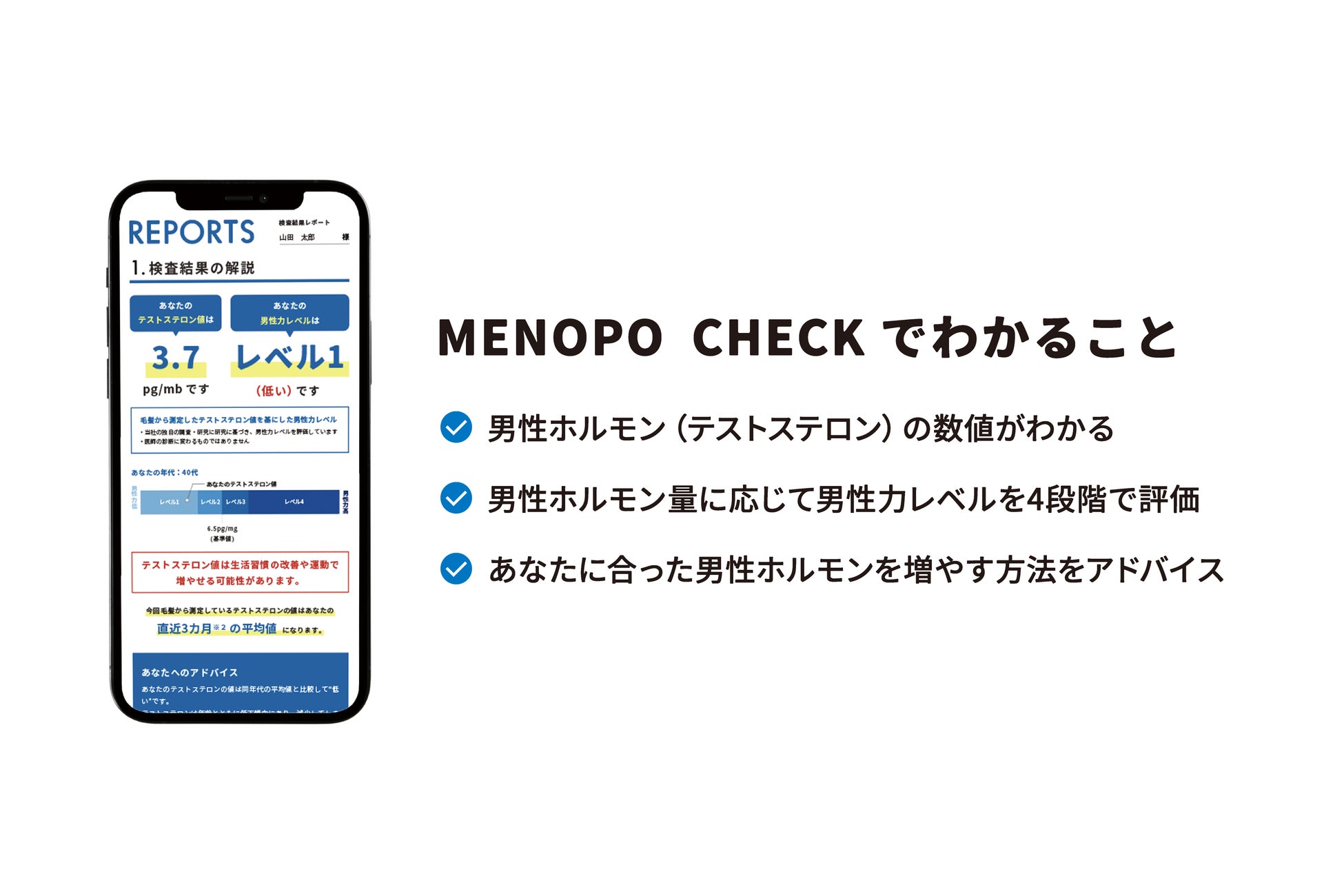 4. テストステロン量を数値化でき、男性力が4段階でわかる