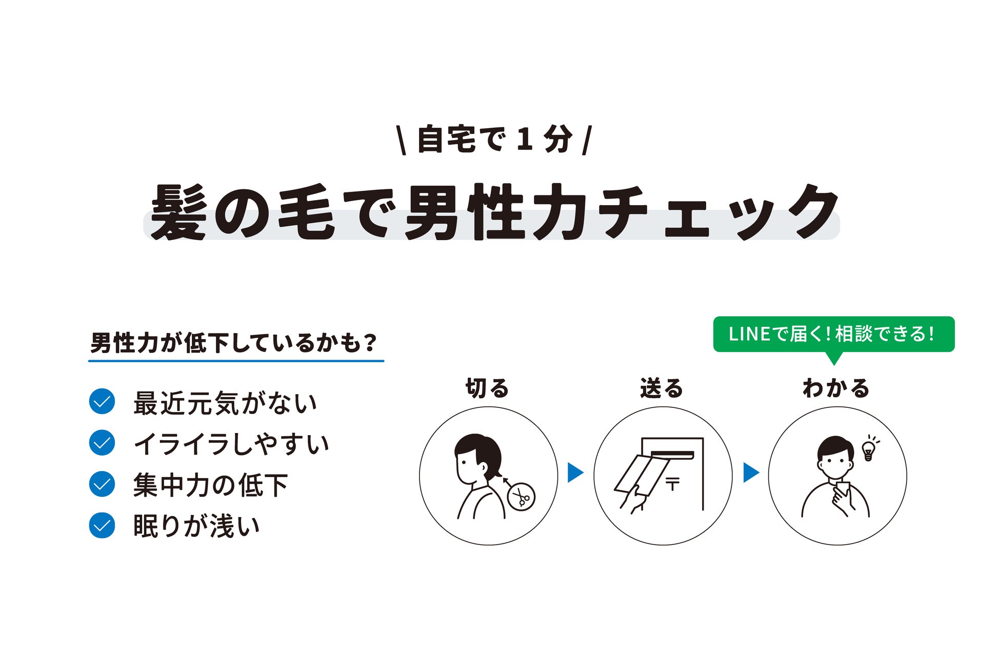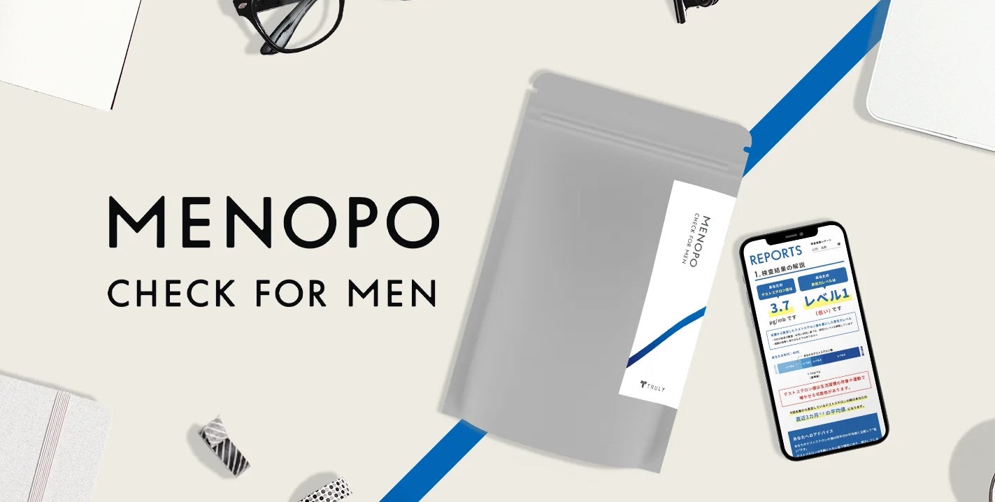 MENOPO CHECK FOR MENでは、あすか製薬メディカルの最新の検査技術を活用し、病院に行くことなく自宅でご自身の髪の毛をカットして送るだけで、検査が可能。結果レポートでは臨床試験で得たテストステロン量の分布からご自身の男性ホルモン、男性力の現状を把握することができます。さらに、男性ホルモンが低下している場合には男性ホルモンを増やすためのアドバイスや、TRULY専門家にLINEで相談することができるサービスも付随しており、結果を送るだけではなく一人ひとりのお悩みにTRULYが寄り添い、課題解決までをカバーいたします。