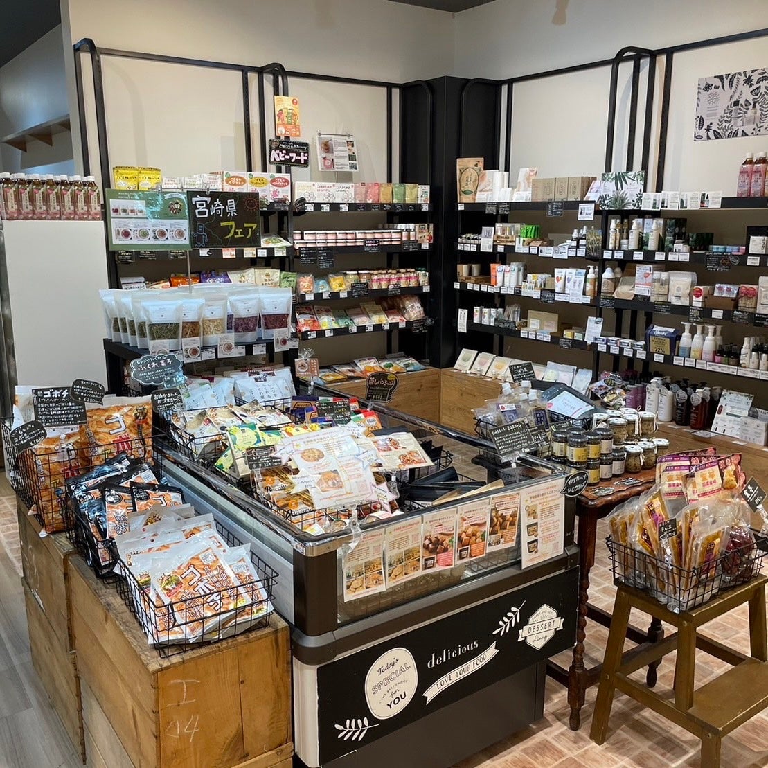 KUMU ORGANIC MARKETがセレクトした宮崎県無添加⾷品コーナー、⾝体にやさしく今の季節に美味しい⾷品が並んでおります。