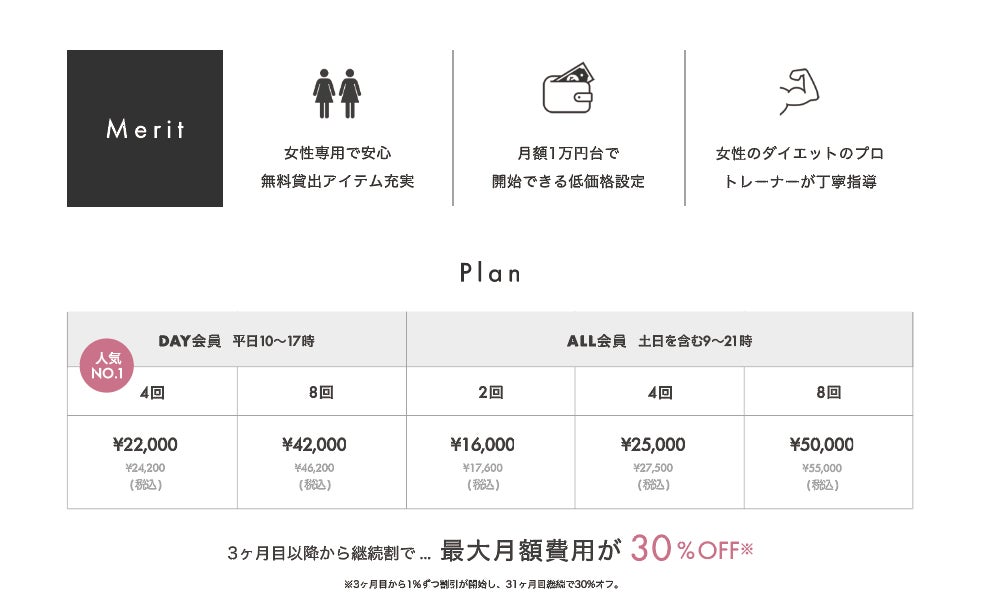 また、UNDEUX SUPERBODY藤沢店は「月額制」を採用します。月4回(*1)のパーソナルトレーニング(栄養指導込み)が月額24,000円です。パーソナルジムの品質は一切落とさず、低価格を実現しました。