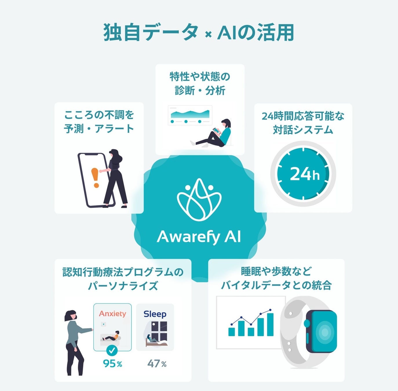 株式会社Awarefyは、「心の健康を支えるデジタル・メンタル・プラットフォームを実現する」をミッションに、デジタル認知行動療法アプリ「Awarefy」 の企画・開発・運営を行っています。