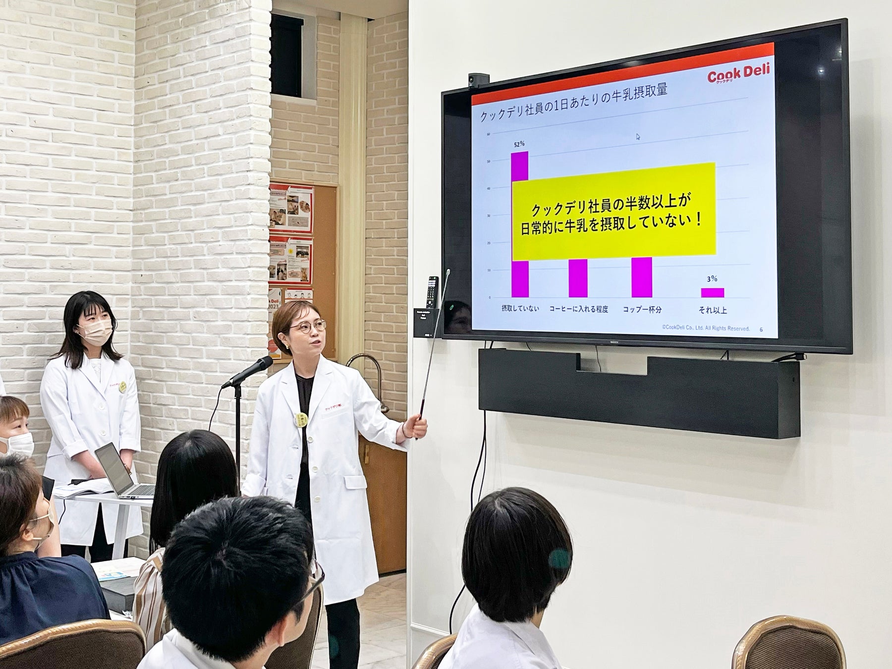今回、「クックデリ栄養Wonder2023」を開催するにあたり社員に栄養調査を実施しました。その結果、クックデリ社員の半数以上が日常的に牛乳を摂取していないことがわかりました。セミナーでは、毎日の食事に200mlの牛乳をプラスするだけでカルシウムのほか、良質な乳たんぱく質、脂肪酸、加えてビタミン・ミネラルも摂取できると発表。また、牛乳を飲むとお腹を壊しやすい(乳糖不耐※)という社員に向けて「温めて飲む」「料理にプラスする」などおすすめの摂取方法も紹介し、健康のために摂取を推奨しました。