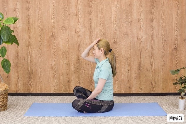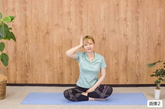 ②頭を左に傾けようとします。この時、左手で反発するように傾けた頭を押さえます。頭と手で押し合いましょう。首や肩の筋肉に力が入った状態で5秒キープし、力を抜きます。これを2セット行います。(画像1参照)