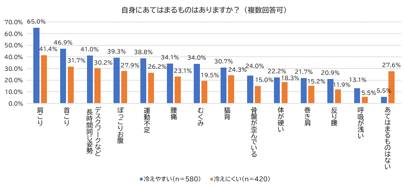 今度は、冷えやすい・冷えにくい女性それぞれに「自身にあてはまることはあるか?」聞きました。最多は共に「肩こり」(冷えやすい:65.0%、冷えにくい:41.4%)、以下「首こり」(冷えやすい:46.9%、冷えにくい:31.7%)、「デスクワークなど長時間同じ姿勢」(冷えやすい:41.0%、冷えにくい:30.2%)、「ぽっこりお腹」」(冷えやすい:39.3%、冷えにくい:27.9%)、「運動不足」(冷えやすい:38.8%、冷えにくい:26.2%)と続きました。また、「あてはまるものはない」(冷えやすい:5.5%、冷えにくい:27.6%)は冷えにくい女性が20ポイント以上も多い結果となりました。
