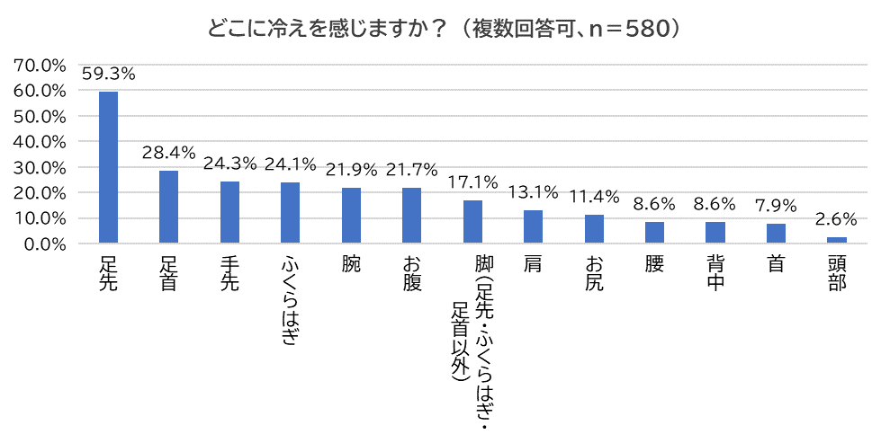 「とても冷えを感じる」「やや冷えを感じる」と回答した(冷えやすい)女性に「どこに冷えを感じるか?」聞きました。約6割(59.3%)が「足先」と回答し最多となり、「足首」(28.4%)、「手先」(24.3%)、「ふくらはぎ」(24.1%)、「腕」(21.9%)、「お腹」(21.7%)と続きました。