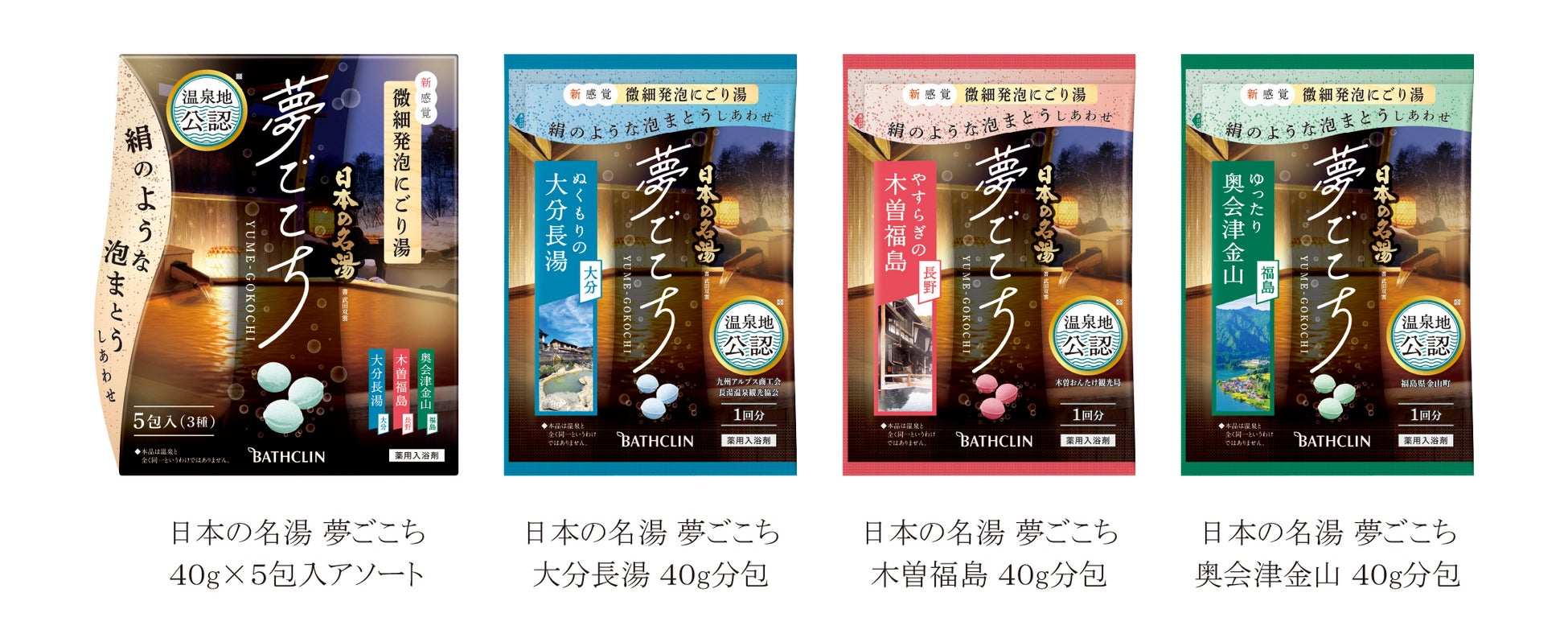 ご自宅で気軽に旅行気分を楽しめると、ご好評いただいております『温泉地公認※』入浴剤「日本の名湯」シリーズから、新感覚の微細発泡にごり湯をお楽しみいただける「日本の名湯 夢ごこち」を8月22日(火曜日)に新発売いたします。「日本の名湯 夢ごこち」には「大分長湯」「木曽福島」「奥会津金山」の3アイテムが新登場。炭酸泉として名高い「大分長湯」「木曽福島」「奥会津金山」をイメージして開発しました。