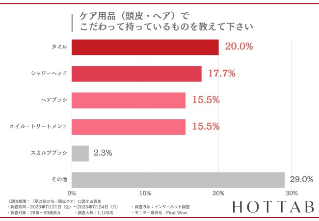 頭皮や髪の毛を傷めずにケアする方法として、ドライヤーで丁寧に乾かす方法がありますが、そういった頭皮・髪の毛への気遣いからか、「タオル:20%」が最もこだわりっているという結果になりました。