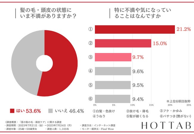 ここまでの調査で、ケアの方法や、こだわりのアイテムなどが判明してきましたが、その努力に対し現状の状態にどれくらい満足しているのが、「髪の毛・頭皮の状態にいま不満がありますか」と質問したところ、回答の半数以上が、「今の状態に不満:53.6%」という回答結果となりました。
