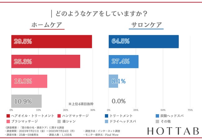 ホームケアの上位では「ヘアオイル・トリートメント」「ハンドまたはブラシマッサージ」が上位を占めていますが、第4位に「湯シャン:10.9%」と、アイテムを用いないケア方法を実践している方が10%ほどといることがわかりました。