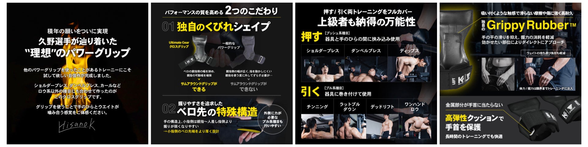 約1年半の歳月を経て、ようやく完成した理想のパワーグリップを皆様へお届けできることをとても嬉しく思っています。「クロスグリップ」という名前にはトレーニングの質を高めるための私なりの2つの哲学を込めています。一つは、手の回旋への意識。私は基本的に親指と小指を両方を意識的に使うべきだと考えており、本製品は動作中の外側への回旋と内側への回旋を強調できるよう細部までこだわりました。もう一つは、押す&引く両動作へのサポート。上級者であるほど高重量を扱いますが、パワーグリップの有用性はプル系動作に限られたものではありません。プッシュ系にもパワーグリップの活用メリットはあり、パフォーマンスの極大化を第一に考えるならウェイトの準備や片付けまで活用幅は広がります。この製品では、その可能性を私なりに徹底追求しました。これから高重量に挑戦したい方はもちろん、様々なパワーグリップを使われたことのある上級者にこそ、是非試していただきたい自信作です。