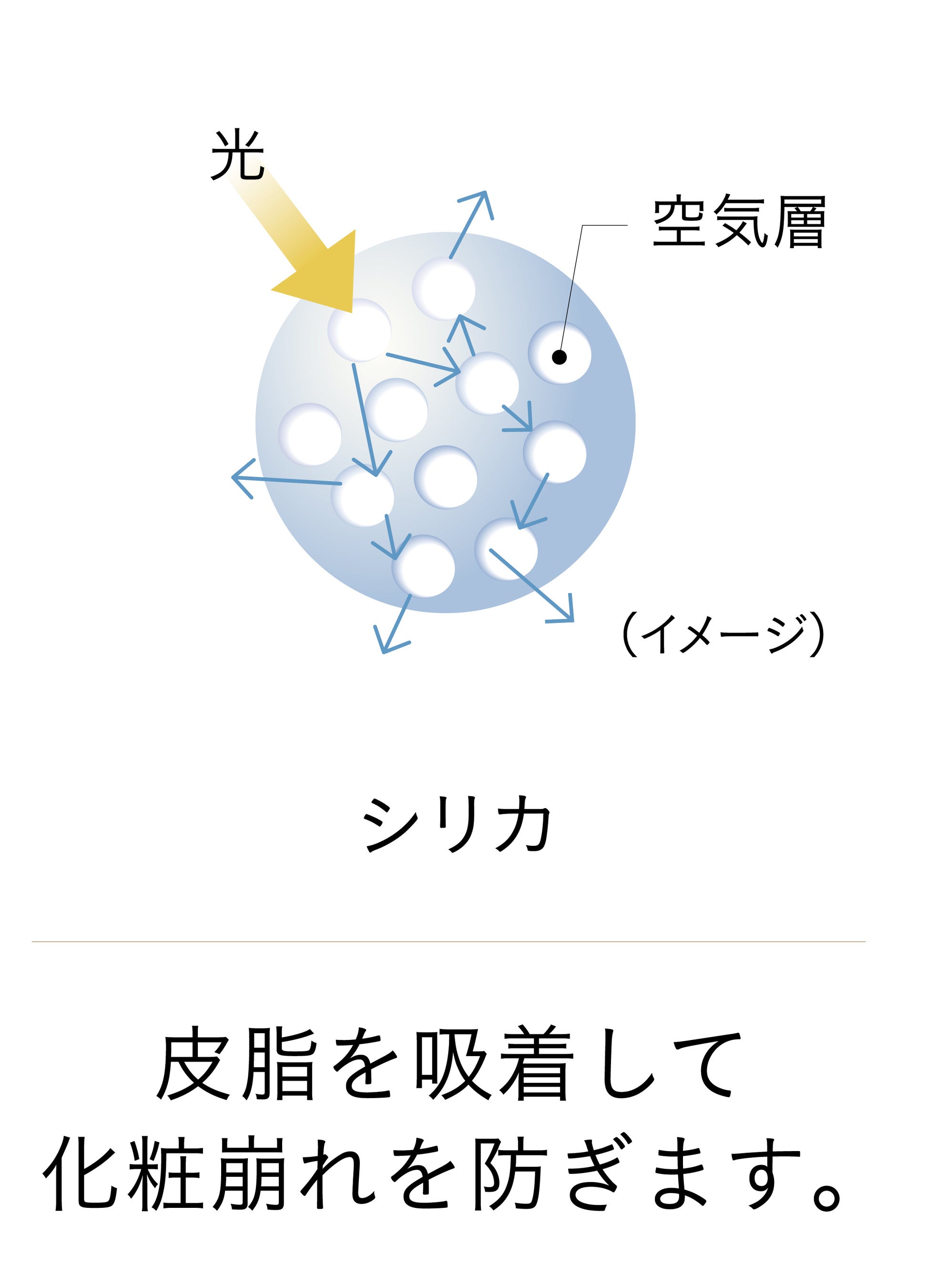 するっと軽やかに伸び広がる2種の球体パウダーが、 光の乱反射で毛穴の影や小ジワなどをふんわりぼかし、目立たせなくさせます。