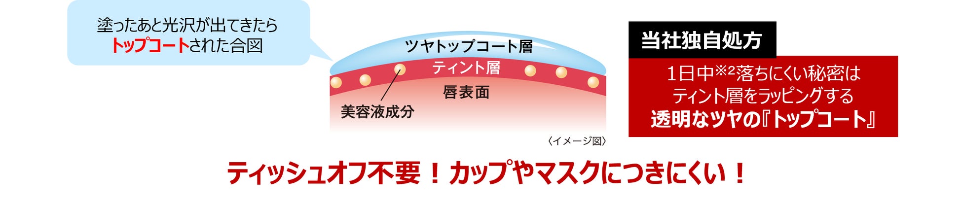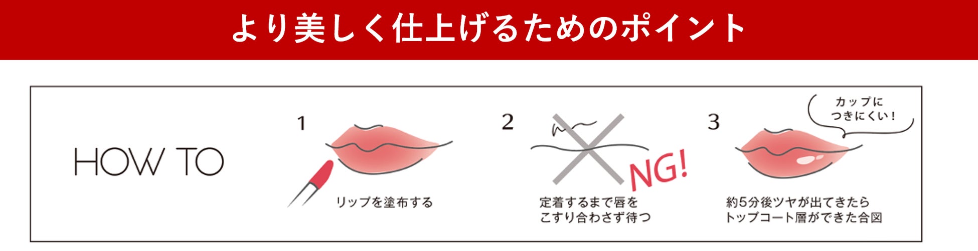 リップを塗布して約5分後※8 、ツヤが出てきたらトップコート層ができた合図です。