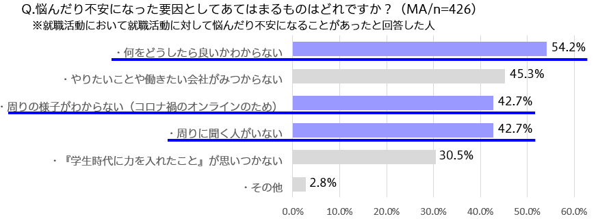 悩んだり不安になった要因を聞いたところ、「何をどうしたら良いかわからない」と回答した人が半数以上で、周りの様子がわからなかったり、周りに聞く人がいないなど、オンラインならではの要因も見られました。コロナ禍で情報流通量は増えたにも関わらず、半数以上が漠然とした不安があり、周囲とのリアルなコミュニケーション不足や、会えないという状況自体が不安の要因にもつながっていたのかもしれません。