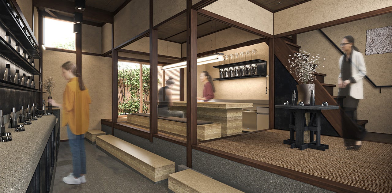 旗艦店となる京都東山店は、まちの喧騒から離れた一角に位置する、100年近い歴史をもつ一軒家をリノベーションしたものです。庭には日本の伝統工法である洗い出しの床を使用。その奥には小さな畑を作りました。1Fには食堂を構え、畑の収穫物を使った発酵食と、製品に使用している黒米を楽しむことができます。