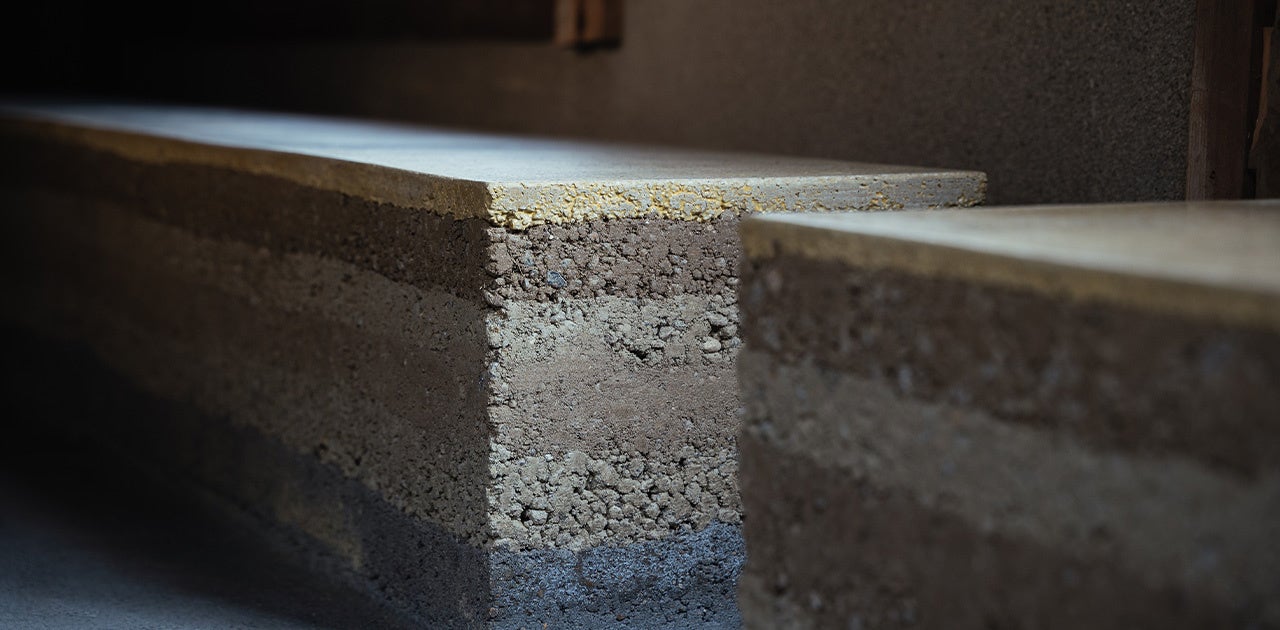 有機農法における滋養豊かな土づくりは“発酵”がカギになります。土に棲む微生物が堆肥の有機を発酵させ、植物の根っこが栄養を取り込みやすい状態に分解します。「FAS」はこの土がもつ特性に「黒米発酵液」との縁を感じ、建材用の土を店舗作りに使用することにしました。何千年もかけて堆積した土には、その産出場所によって多彩な色や質のものがあり、「FAS 京都東山本店」では、京都市伏見区深草の地層から採取した浅黄色の土「深草土」を選びました。土を強く突き固め、幾層にも重ねて建材とする、版築(はんちく)と呼ばれる技法を取り入れています。