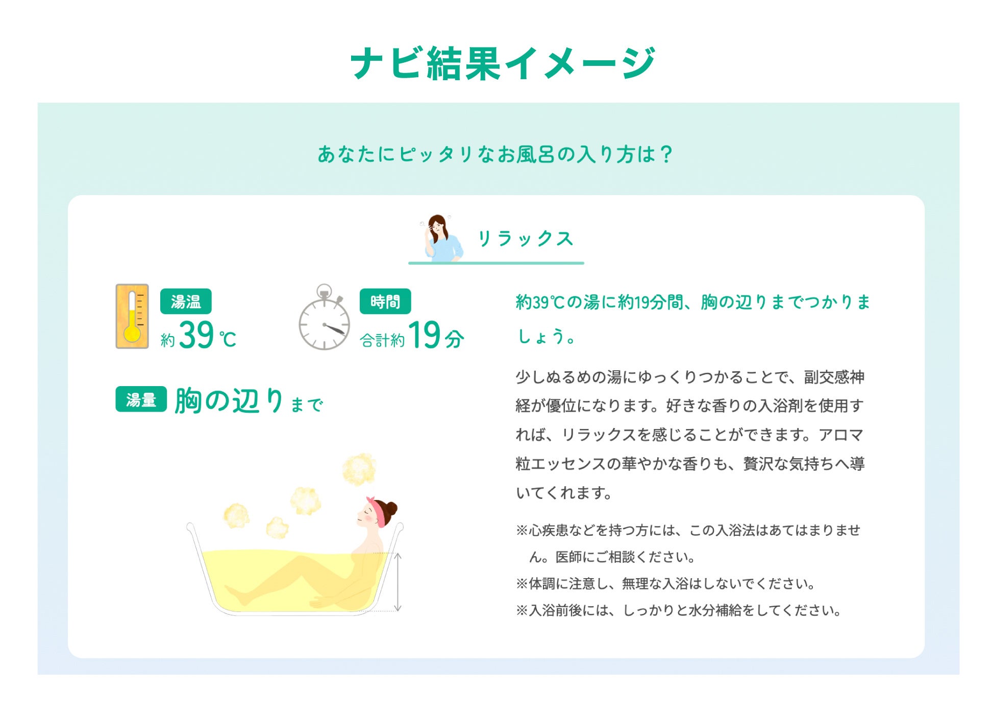 入浴法で気になる不調にアプローチ。当社独自のアルゴリズムで、あなたにピッタリな入浴法が見つかります。