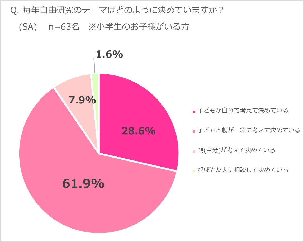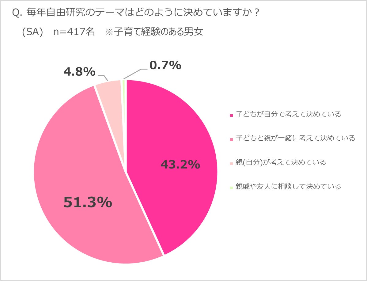 子どもだけではなく、夏休みの宿題を手伝う親も負担だと感じている自由研究に関して、「毎年自由研究のテーマはどのように決めていますか?」という質問をしたところ、「子どもと親が一緒に考えて決めている」回答した方が半数以上に上りました。特に小学生の子どものいる方では6割以上が一緒に考えて決めていると回答しており、自由度の高い宿題でありながら完成度の高さも必要になることから、小学生の子どもだけで自由研究をやりきることの難しさとそれに伴う親のサポートの必要性がうかがえます。