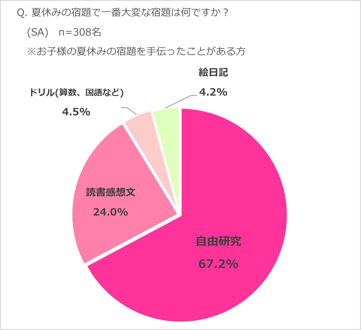 さらに、夏休みの宿題のなかでも一番大変な宿題を聞いたところ「自由研究」が67.2%となり、ダントツ1位であることが分かりました。