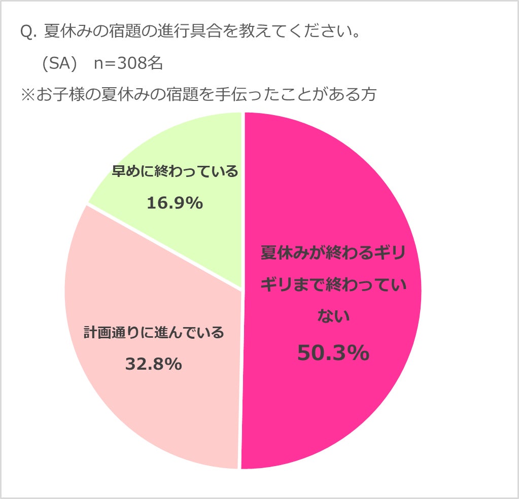 夏休みの宿題は「夏休み期間ギリギリまで終わっていない」という回答が半数。 宿題の追い込みは毎年8月後半にしている家庭が9割以上に!