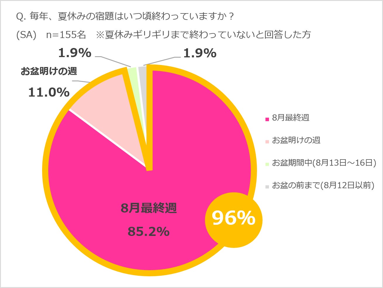 毎年の夏休みの宿題の進行具合についても質問したところ、「夏休み期間のギリギリまで終わっていない」と回答した方が半数以上となりました。宿題が終わるのはいつ頃かと聞いたところ、「8月最終週に宿題を終える」という回答が85.2%、「お盆明けの週」という回答が11.0%となり、9割以上の家庭が8月後半に宿題の追い込みをしている傾向にあることが判明しました。