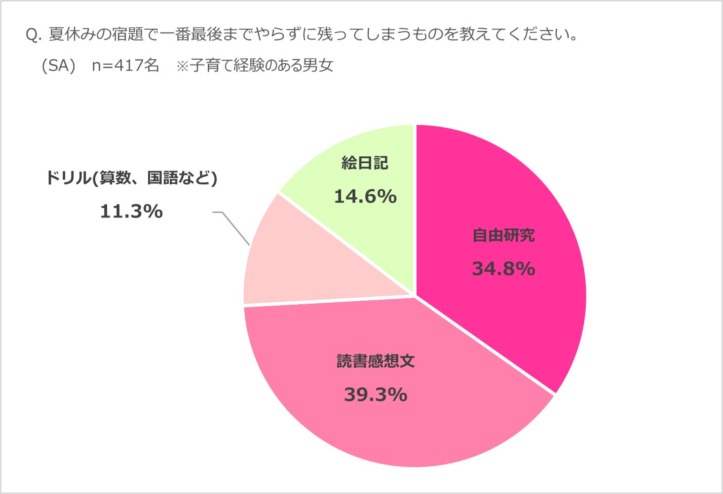 「夏休みの宿題の中でも一番最後までやらずに残ってしまうものを教えてください」という質問では、1位 「読書感想文」(39.3%)、2位 「自由研究」(34.8%)という結果に。