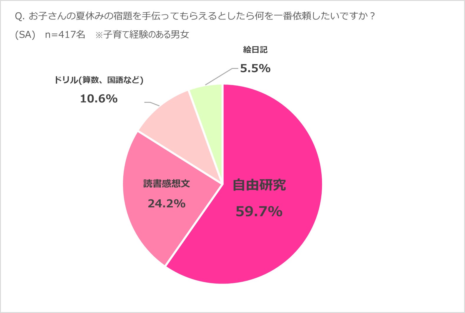 また、「お子様の夏休みの宿題を手伝ってもらえるとしたら何を一番依頼したいですか?」という質問に対しては、「自由研究」という回答がダントツ1位となりました。子どもの学年に合わせ提出できるレベルのテーマ決めから準備、実際の自由研究の進行など手間のかかる「自由研究」は、子育て家庭にとって”毎年恒例の大仕事“となっているといっても過言ではないようです。