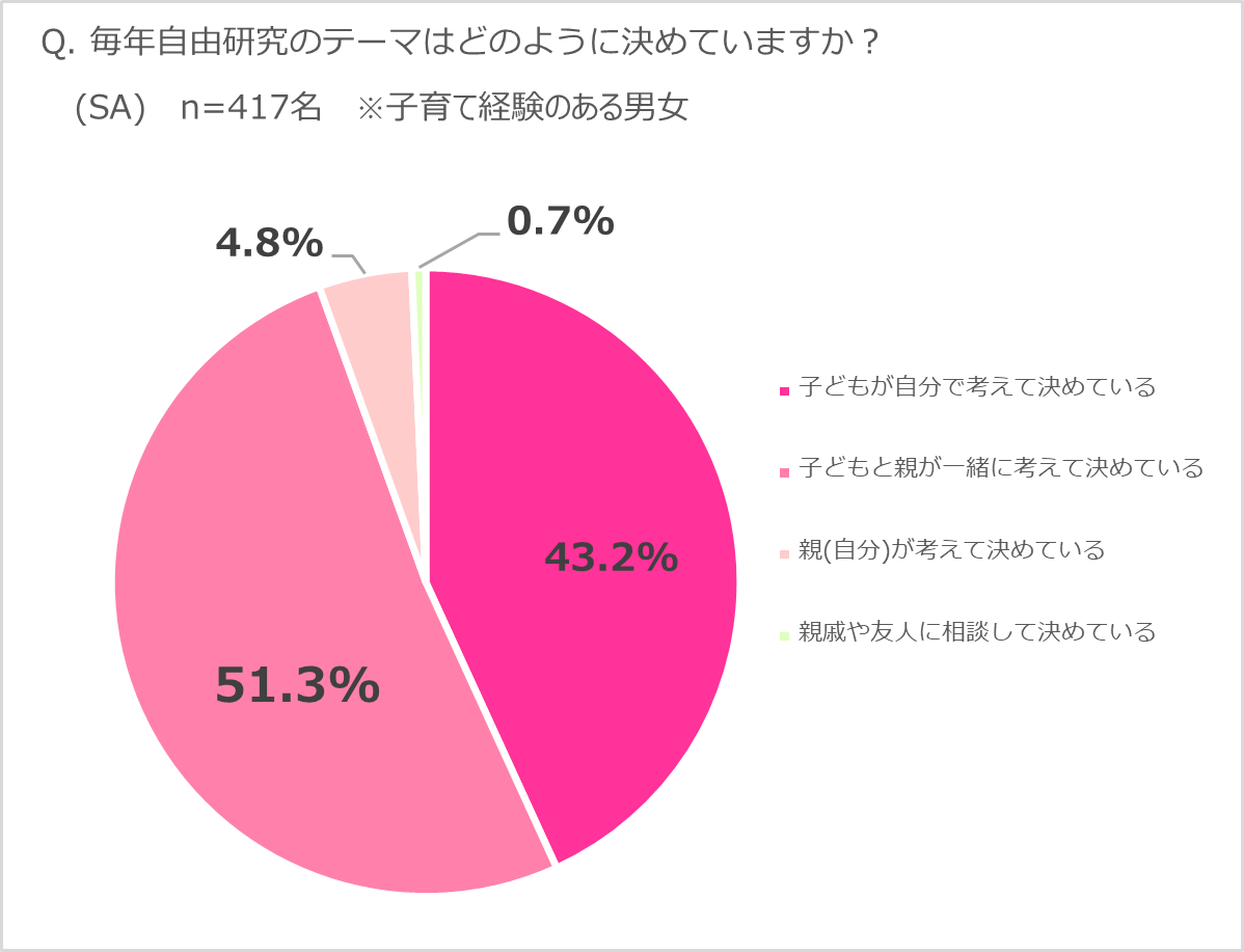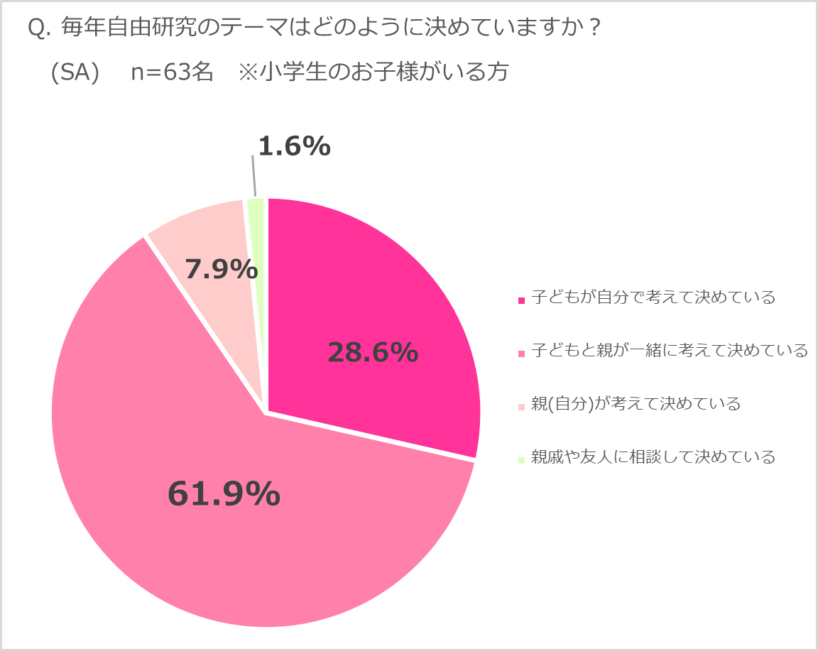 子どもだけではなく、夏休みの宿題を手伝う親も負担だと感じている自由研究に関して、「毎年自由研究のテーマはどのように決めていますか?」という質問をしたところ、「子どもと親が一緒に考えて決めている」回答した方が半数以上に上りました。特に小学生の子どものいる方では6割以上が一緒に考えて決めていると回答しており、自由度の高い宿題でありながら完成度の高さも必要になることから、小学生の子どもだけで自由研究をやりきることの難しさとそれに伴う親のサポートの必要性がうかがえます。