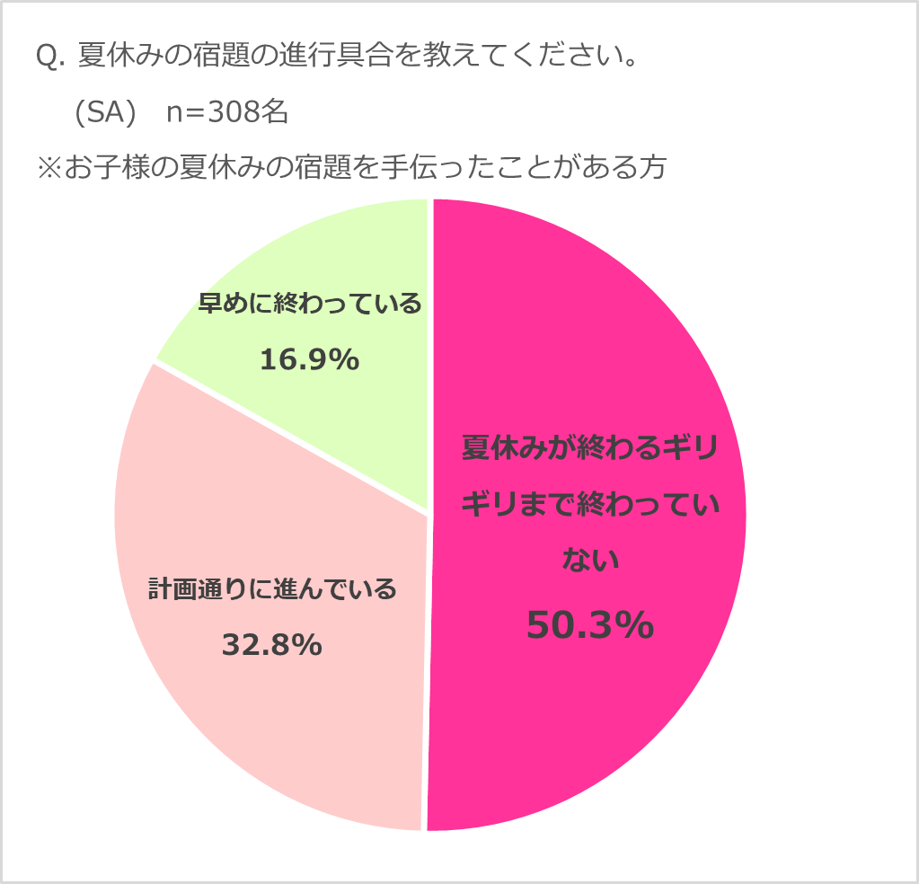 夏休みの宿題は「夏休み期間ギリギリまで終わっていない」という回答が半数。 宿題の追い込みは毎年8月後半にしている家庭が9割以上に!
