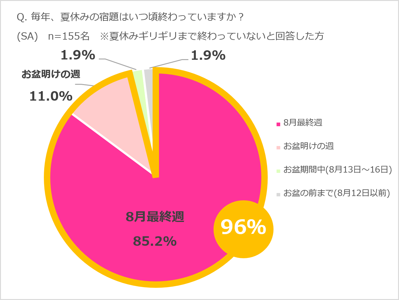 毎年の夏休みの宿題の進行具合についても質問したところ、「夏休み期間のギリギリまで終わっていない」と回答した方が半数以上となりました。宿題が終わるのはいつ頃かと聞いたところ、「8月最終週に宿題を終える」という回答が85.2%、「お盆明けの週」という回答が11.0%となり、9割以上の家庭が8月後半に宿題の追い込みをしている傾向にあることが判明しました。
