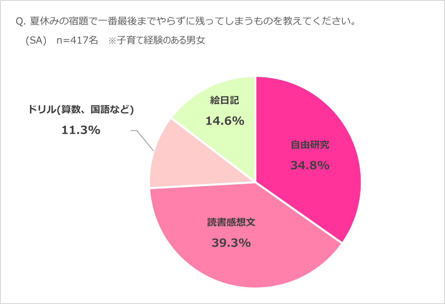 「夏休みの宿題の中でも一番最後までやらずに残ってしまうものを教えてください」という質問では、1位 「読書感想文」(39.3%)、2位 「自由研究」(34.8%)という結果に。