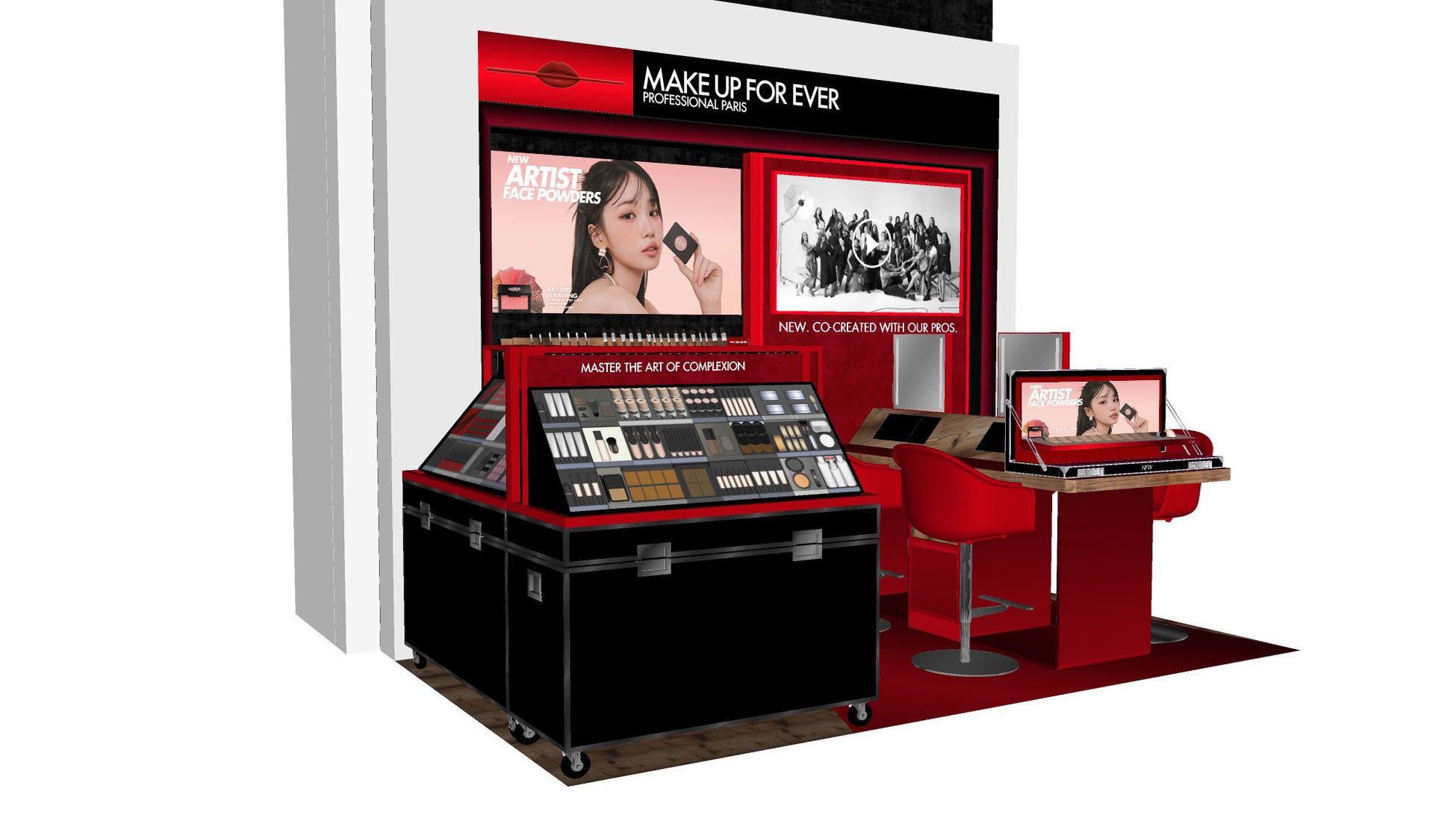 メイクアップフォーエバーを象徴するカラーである赤を基調とした店舗は、足元から、壁、天井まで続くまさにレッドカーペット。そのレッドカーペットを辿ると、ステージの上にはメイクボックスが目の前に現れます。新コンセプトはまさにメイクボックスそのもの。プロのメイクアップアーティスト集団であるメイクアップフォーエバーのDNAが詰まったメイクボックスの中で、私たちの知識や技術、ブランドストーリーやコレクションを余すことなく体現します。