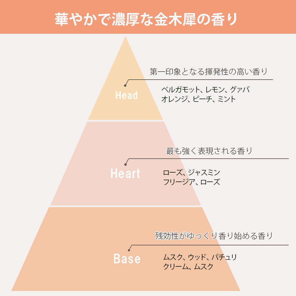 華やかで濃厚な金木犀の香りは、ベルガモットやレモン、オレンジのフルーティーなトップノートに始まり、華やかで軽やかなローズやフリージア、ジャスミンのミドルノートへつながり、ムスクやウッド、クリームの厚みがある濃厚な甘さのラストノートが楽しめる香りになっています。