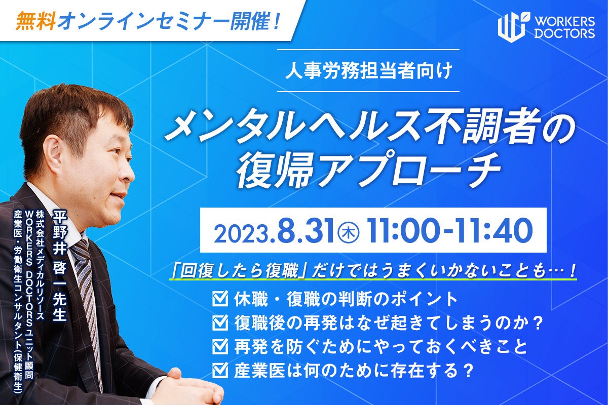 こうした人事労務・健康経営ご担当者様のお悩みに対し、産業医・労働衛生コンサルタントの平野井 啓一が、休職・復職の判断や再発防止のためのポイントなどを解説します!