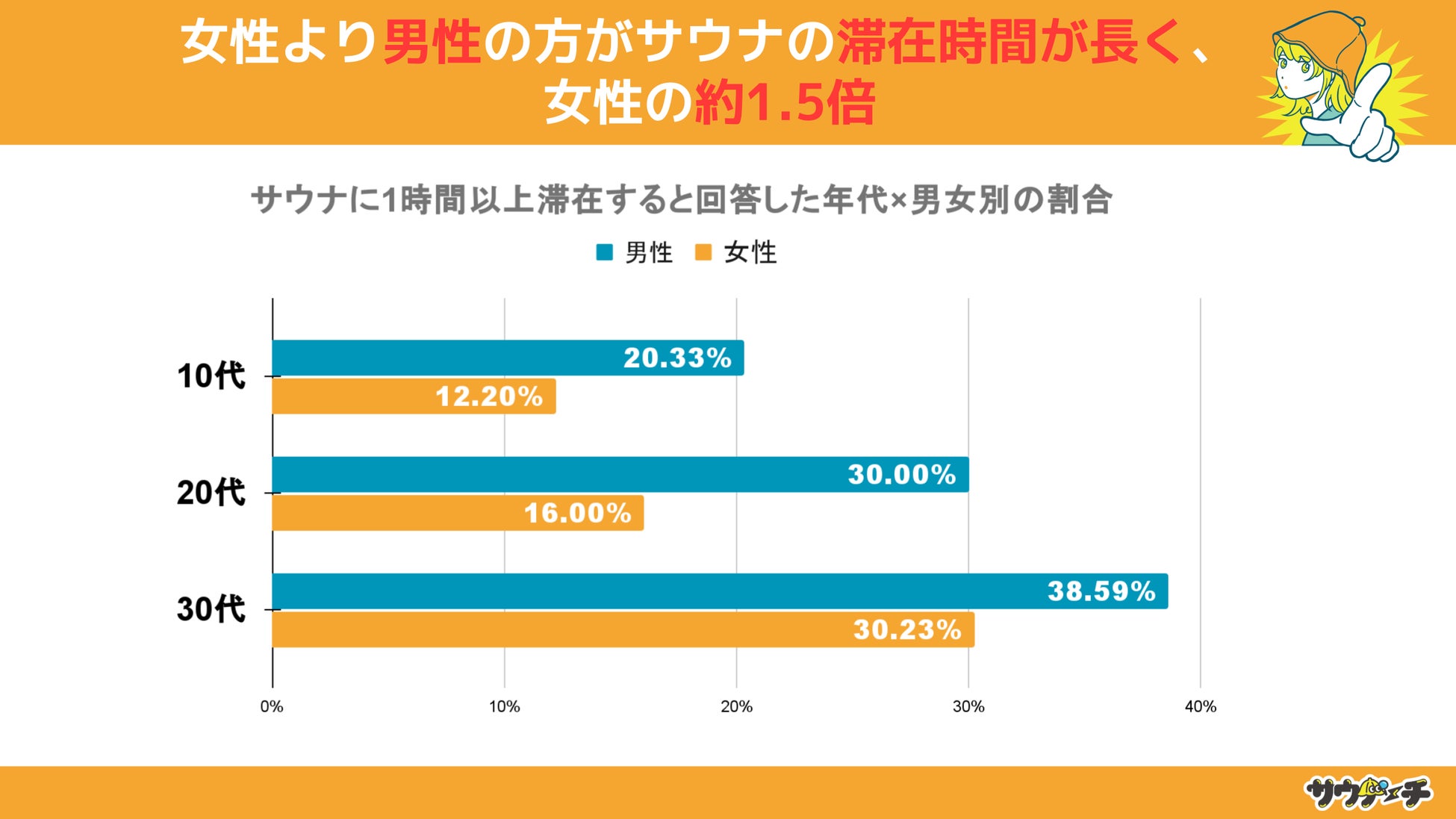 【女性より男性の方がサウナの滞在時間が長く、女性の約1.5倍】