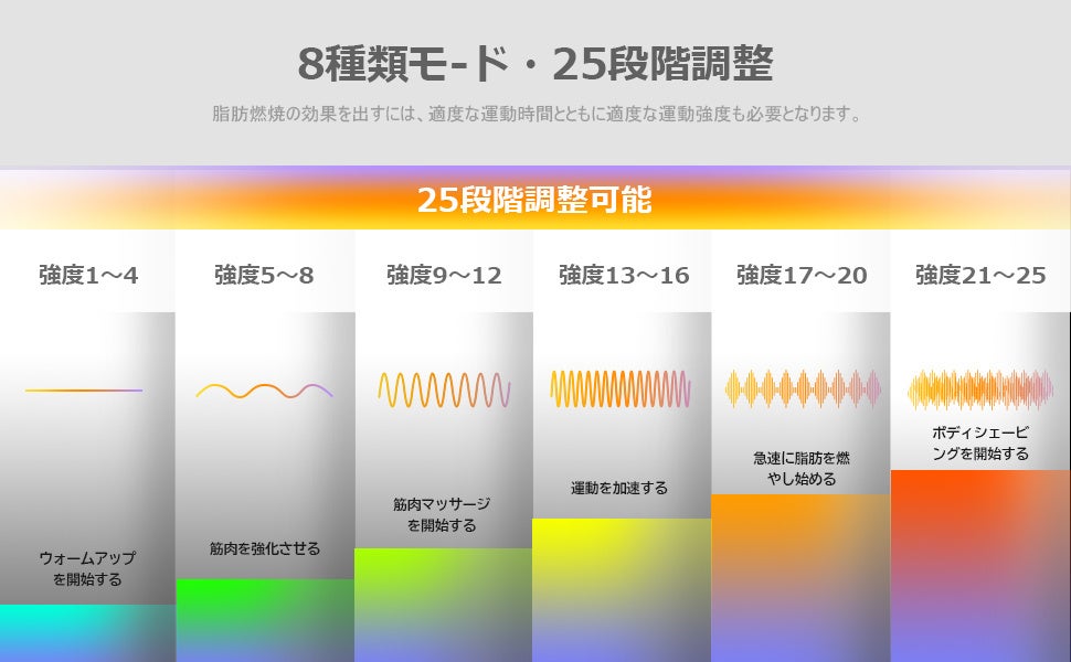 ■トレーニングとクールダウンが組み合わさった8種のモードは「振動」「揉み」「強化」などの再現を目指し、25段階の幅広いパワーレベルは刺激レベルの上がり方も緩やかで、自分好みのレベルをお選びいただくことができます。