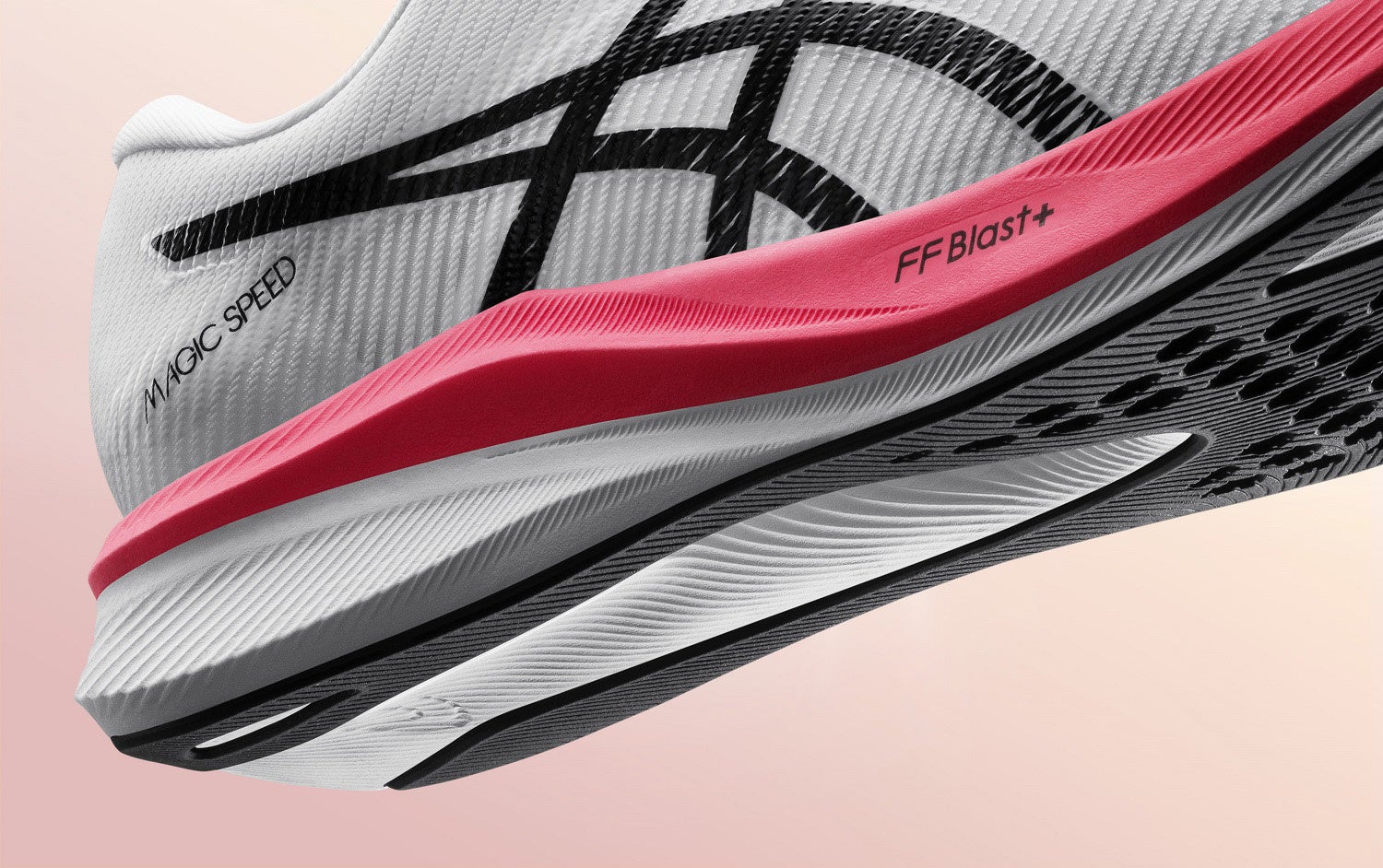 ミッドソールは、全面に軽量で反発性に優れたクッションフォーム材「FF BLAST PLUS(エフエフブラストプラス)」を採用し、軽量でやわらかなクッション性を実現しています。厚みは最大約31mm(かかと部)で、ドロップ(かかと部分の高さとつま先部分の高さの高低差)は約7mmです。