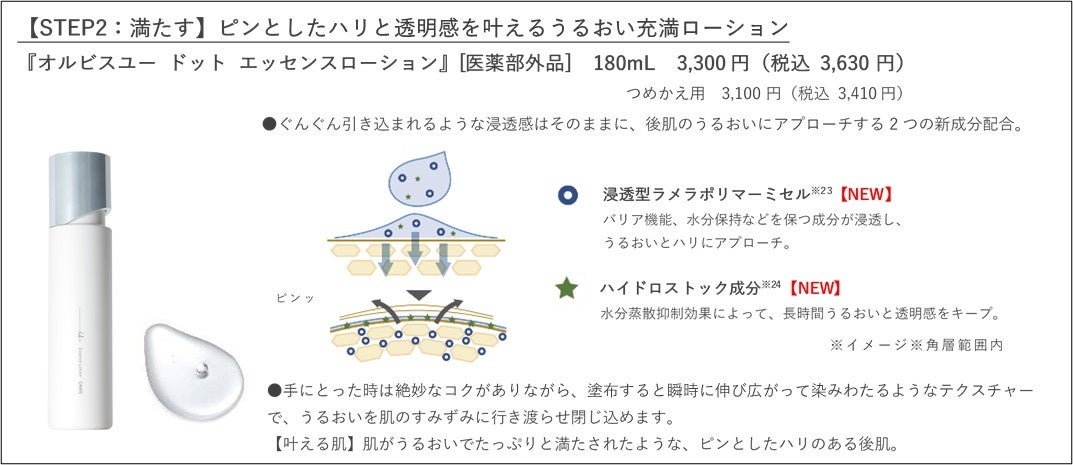 ■ 販売名:『オルビスユー ドット エッセンスローション』[医薬部外品]■ 価格:3,300円(税込3,630円)/つめかえ用 3,100円(税込 3,410円)