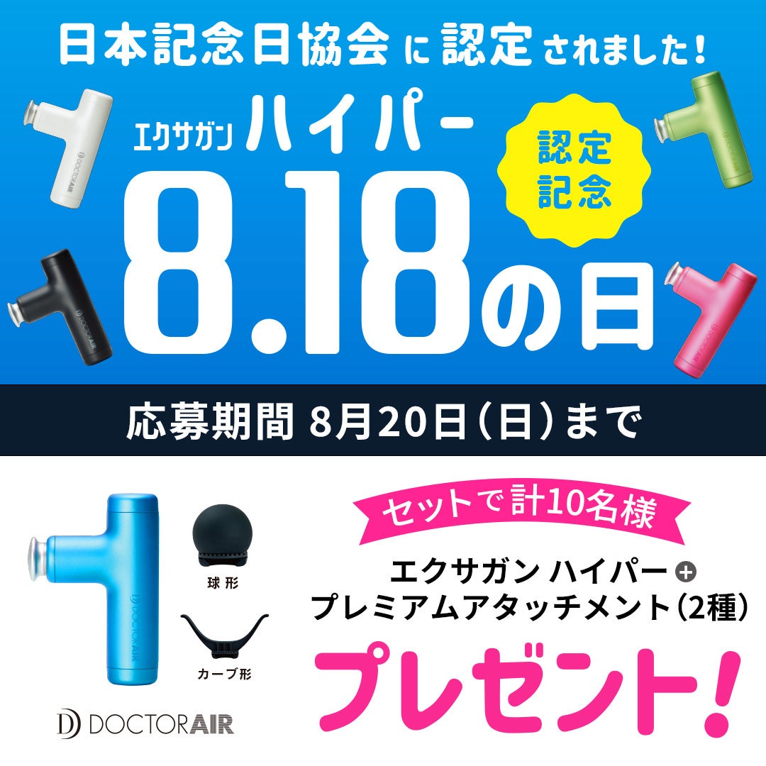 今回、『ドクターエア』では、この【エクサガン ハイパー】をさらに多くの人に知ってもらいたいという思いから「8月18日」を「エクサガンハイパーの日」として制定。そして、一般社団法人日本記念日協会より記念日と認定されました。手軽に身体のケアに使える【エクサガン ハイパー】を通じて、健康についての意識を高めるきっかけや、身体を労る機会にしてください。