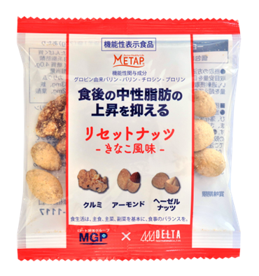 リセットナッツは、食事と一緒に食べるだけで、ストレスなく中性脂肪対策が叶う機能性表示食品です。ロート製薬グループ エムジーファーマの独自開発成分「メタップ」を機能性関与成分として配合し、食事の脂肪の吸収を抑え、食後の血中中性脂肪の上昇を抑えることが報告されています。ナッツに自然な甘みの香ばしいきな粉をコーティング。おやつ感覚としてもお召し上がり頂けます。