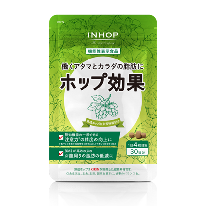 注意力(認知機能)とお腹周りの脂肪(体脂肪)を同時にケアする史上初の機能性表示食品です。世界最大級のハーブであるホップに着目し、20年以上のホップ研究の末に誕生。産学官の研究に裏打ちされた科学的エビデンスに基づく信頼性、2つの機能があるのに少量小粒で飲みやすい形状、食経験豊富なホップという安心感により、元気な毎日に必要なアタマとカラダの健康を手軽にケアできます。