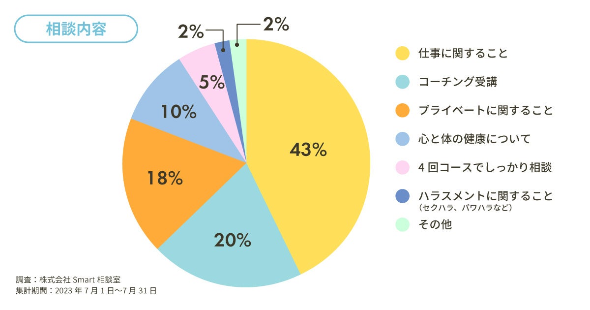 2023年7月の相談内容は、1位「仕事に関すること」43%、2位「コーチング受講」20%、3位「プライベートなこと」18%