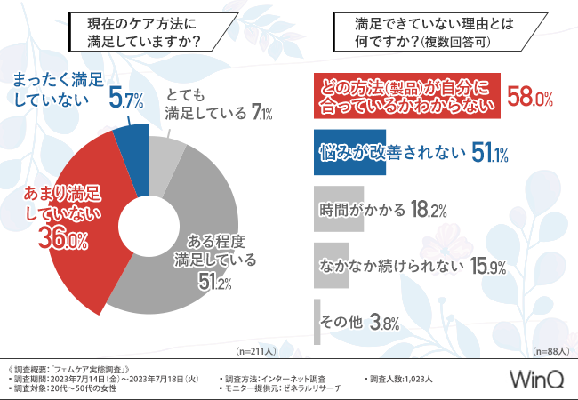 ケアを行って悩みが改善されているのかわからないことや、改善方法がわからないといった理由で現在行っているフェムケアに満足していないことがわかりました。