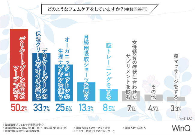 「どのようなフェムケアをしていますか?(複数回答可)」と質問したところ、『デリケートゾーン専用のソープで洗う(50.2%)』と回答した方が最も多く、次いで『デリケートゾーンの保湿クリームやオイルを塗る(33.7%)』『オーガニックコットンの生理ナプキンを使う(25.6%)』と続きました。