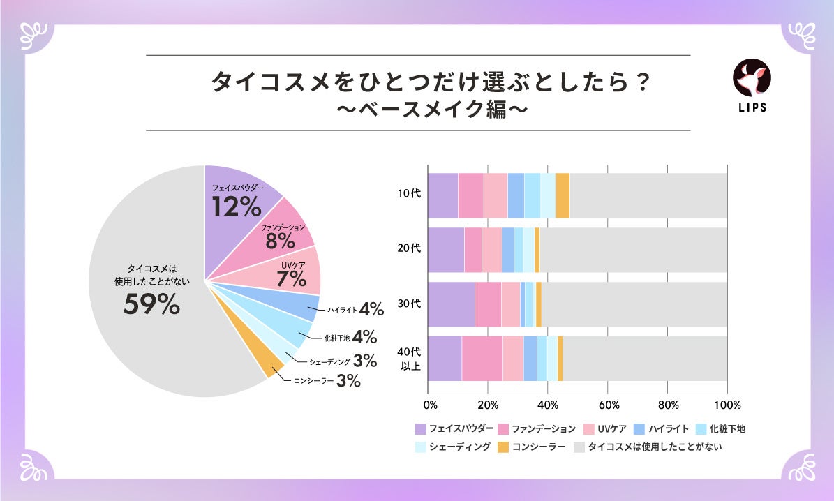 タイコスメのベースメイクの魅力は、「崩れにくさ」の一点に尽きるようです。実際にフェイスパウダー(12%)、ファンデーション(8%)に票が集まった理由として、崩れにくいうえ、メイクを長時間キープできるなどが挙げられています。