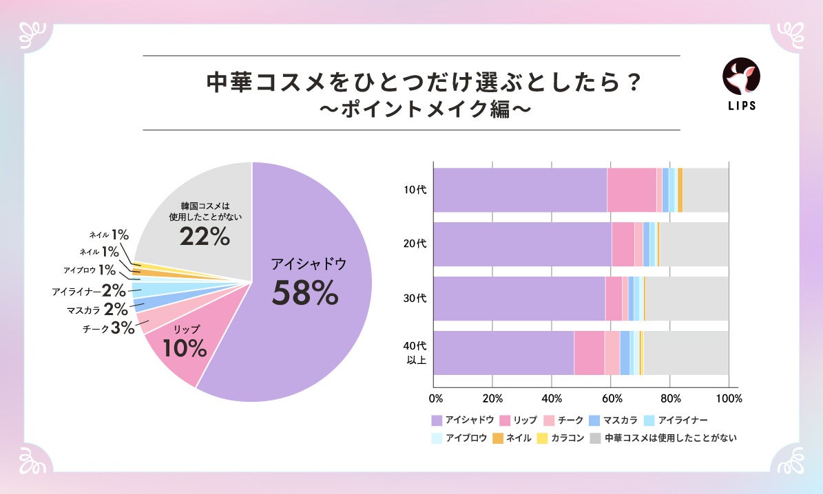 続いて、中華コスメでポイントメイクを選ぶならどのアイテムが欲しいか質問したところ、全体の58%の人がアイシャドウを選択。中華コスメのアイシャドウは、たくさんのユーザーから熱視線が送られる人気アイテムと言えるでしょう。